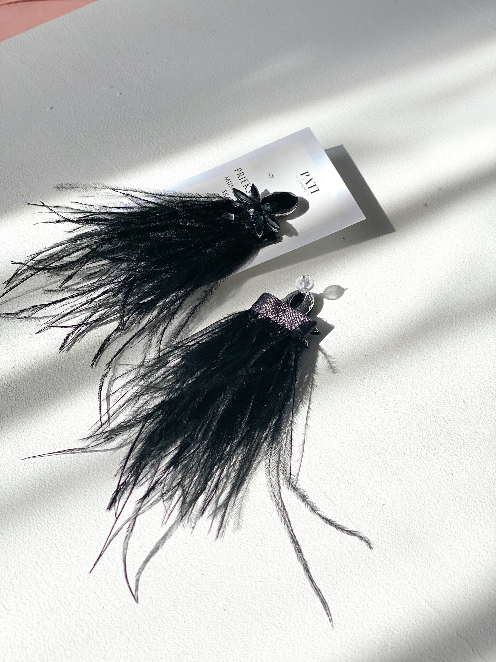 Black, lightweight feather earrings from natural ostrich down. Complemented with black crystals of the same shade. The total length of the earrings is about 13 cm.