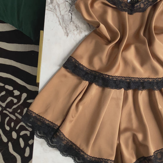 Ērts guļamkomplekts - topiņš ar regulējamām lencītēm un maigu mežģīņu maliņu, sakombinēts ar kupliem, brīviem šortiņiem, kuru piegriezums atgādinās svārkus. Šūta no patīkama, viegli slīdoša satīna auduma, kura pateicīgā struktūra neburzās, kā arī brīvā piegrieztne būs ērta gulēšanai. 100% roku darbs.