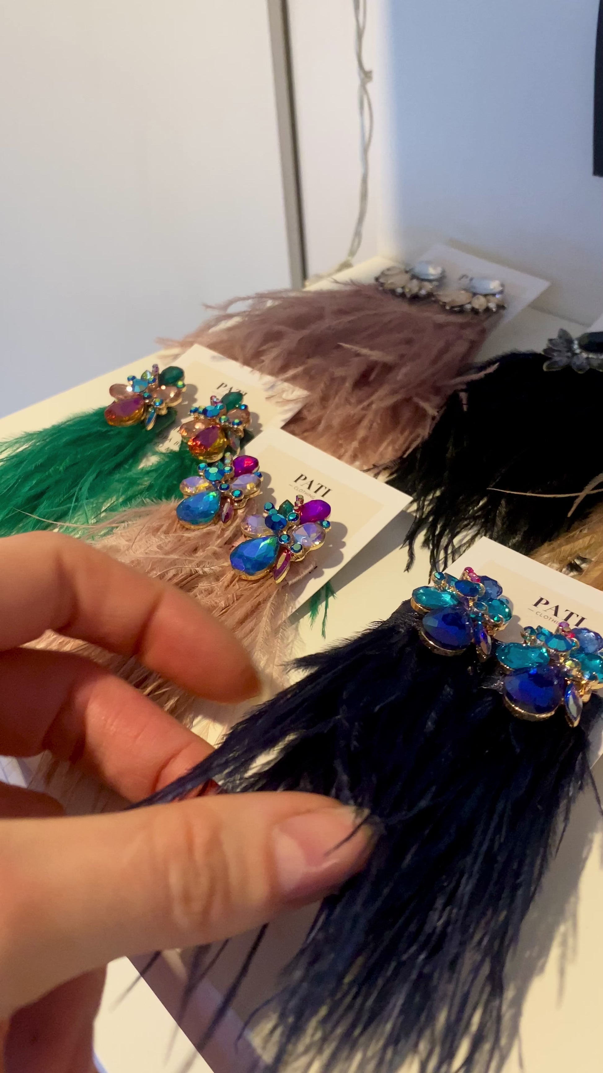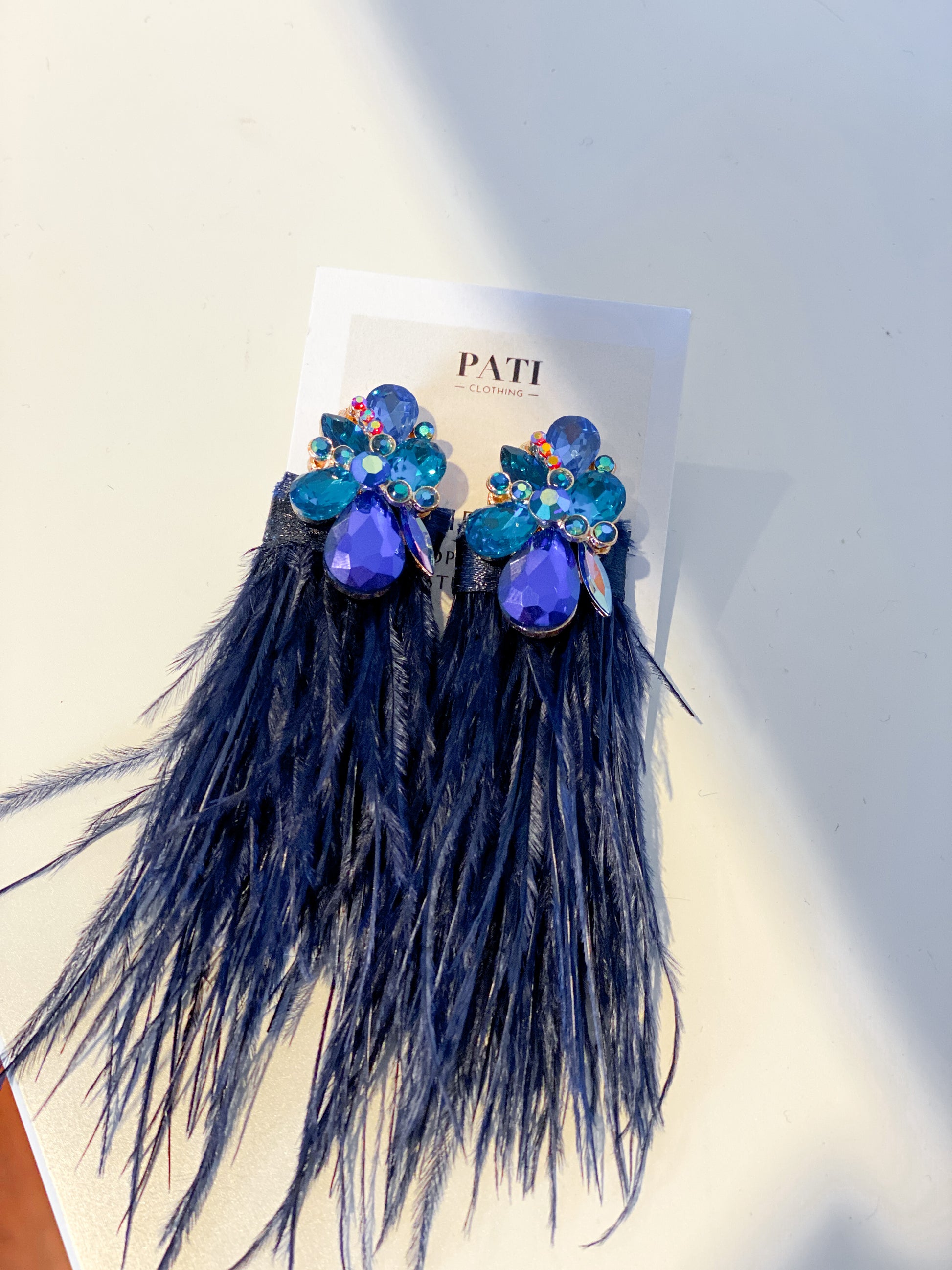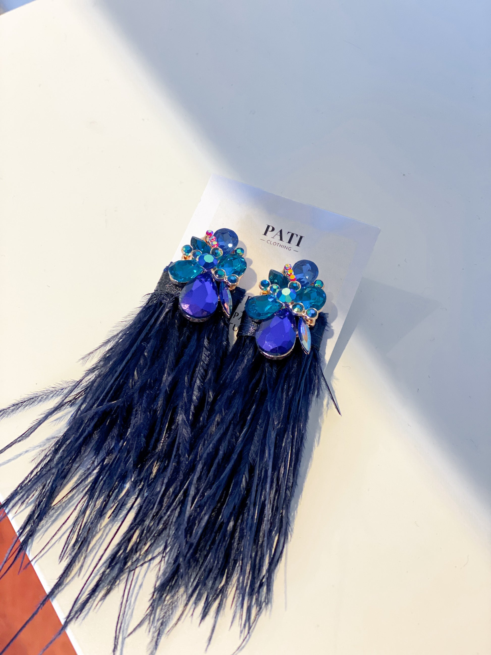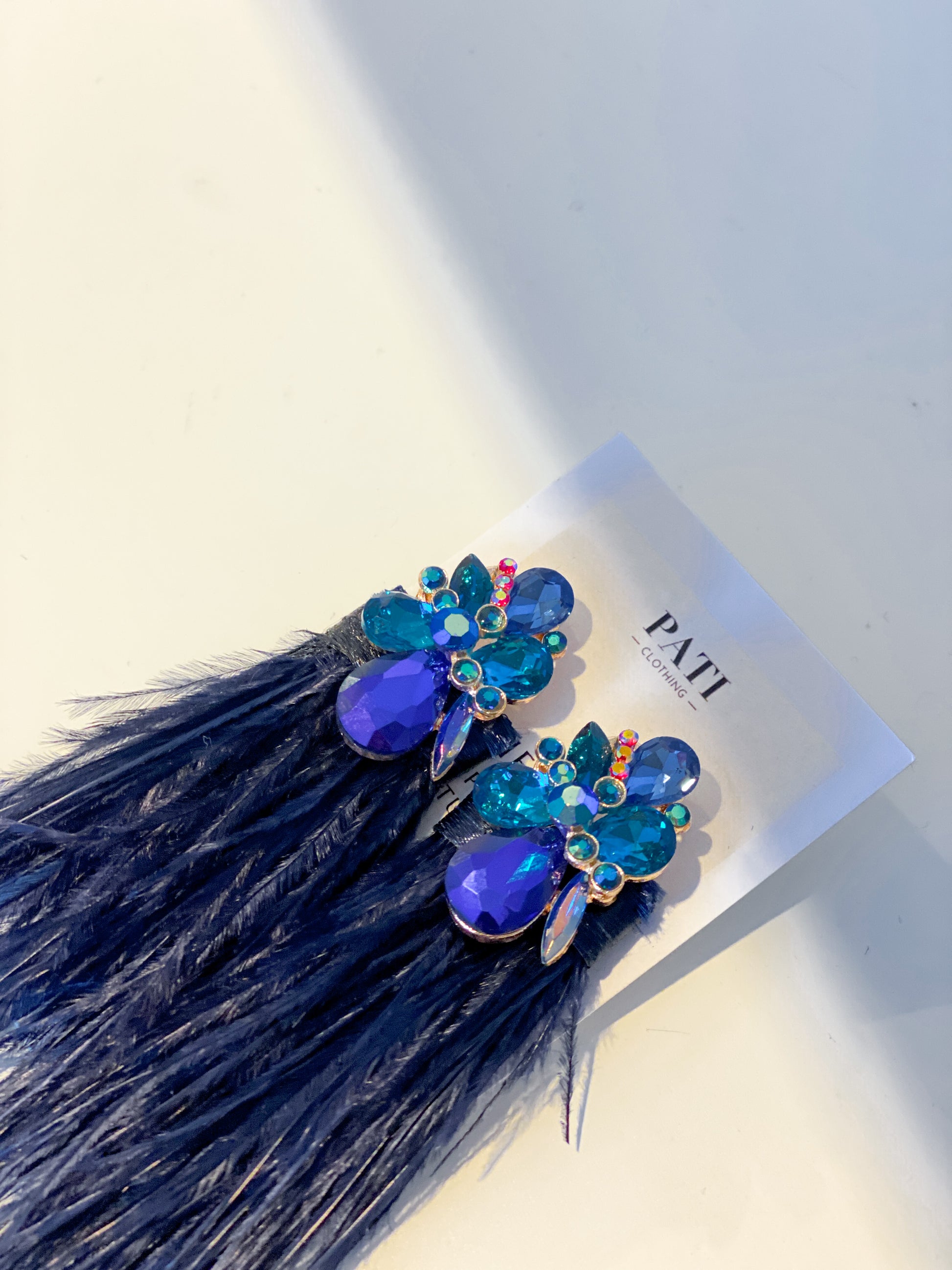 All PATI earrings are uniquely designed, combining high-quality crystals with natural ostrich feathers.
