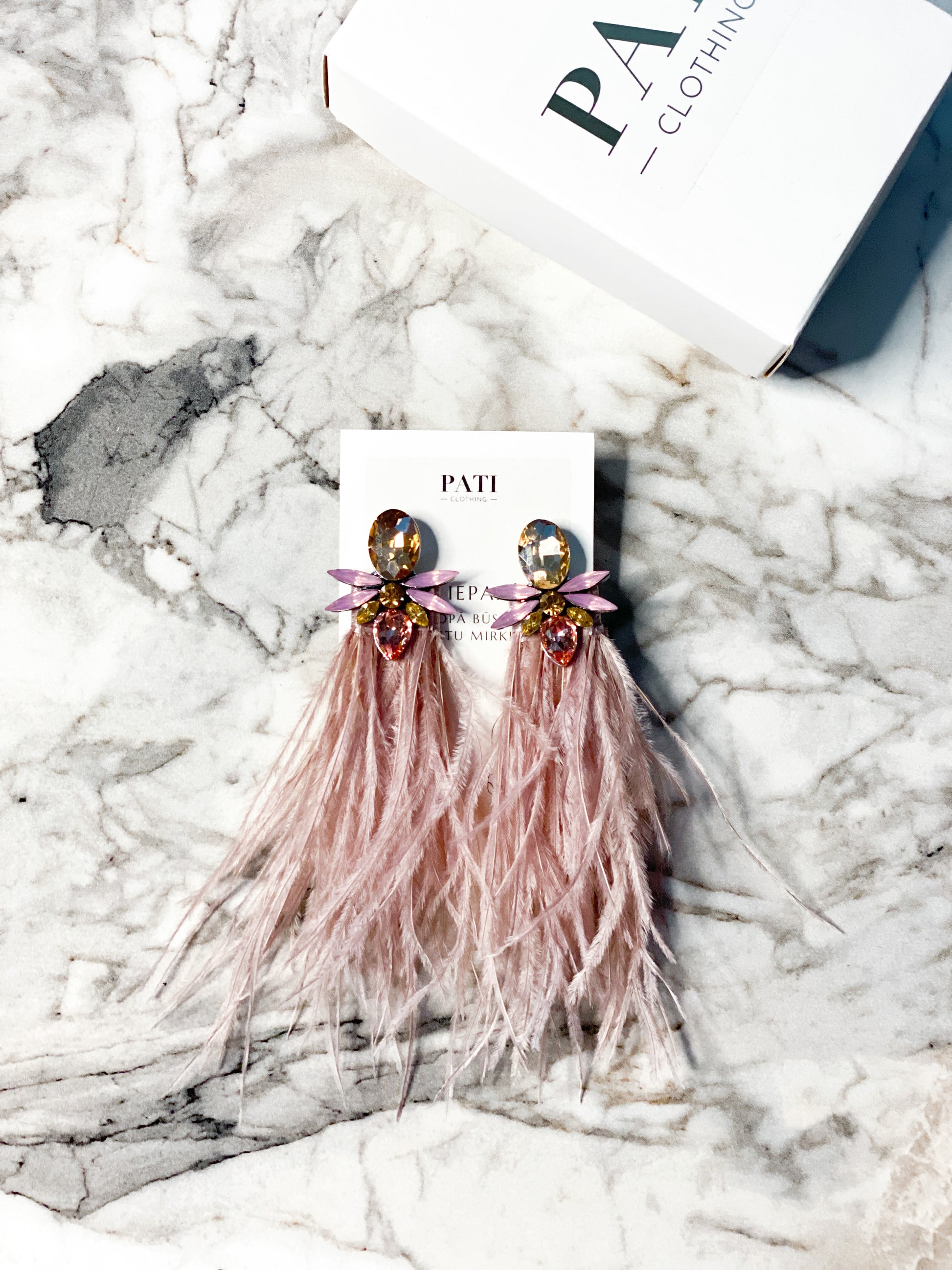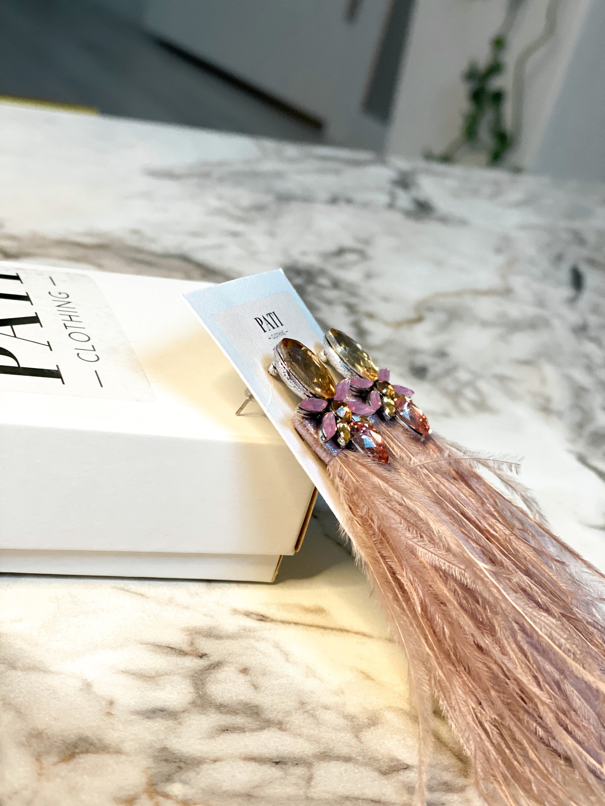 All PATI earrings are uniquely designed, combining high-quality crystals with natural ostrich feathers.