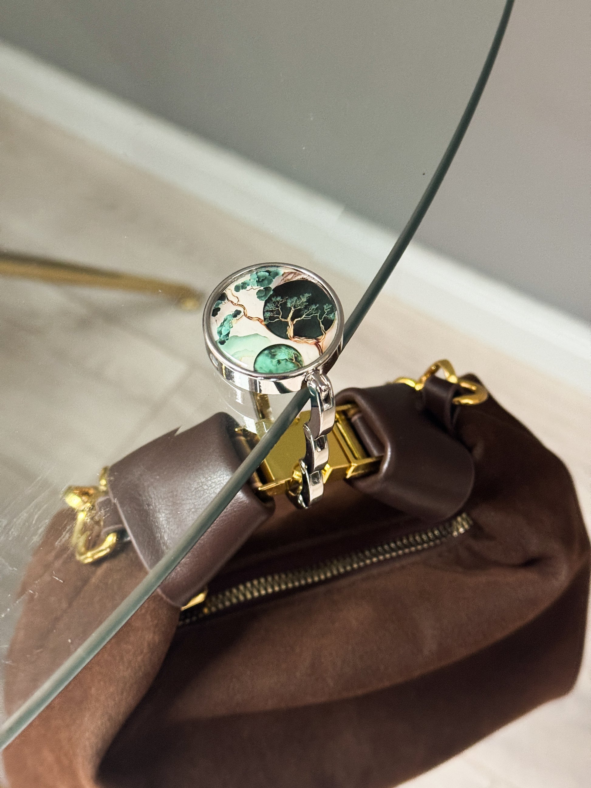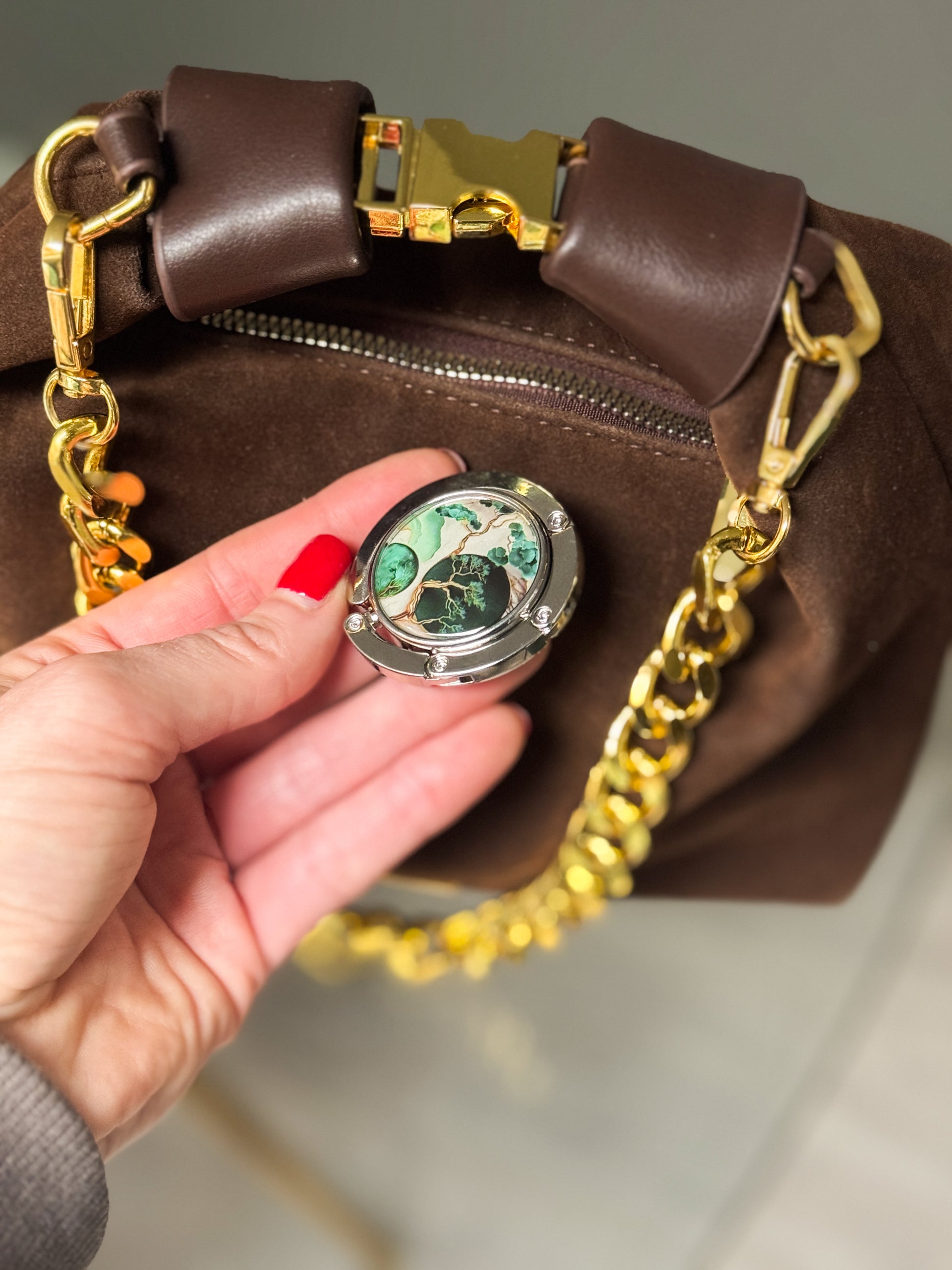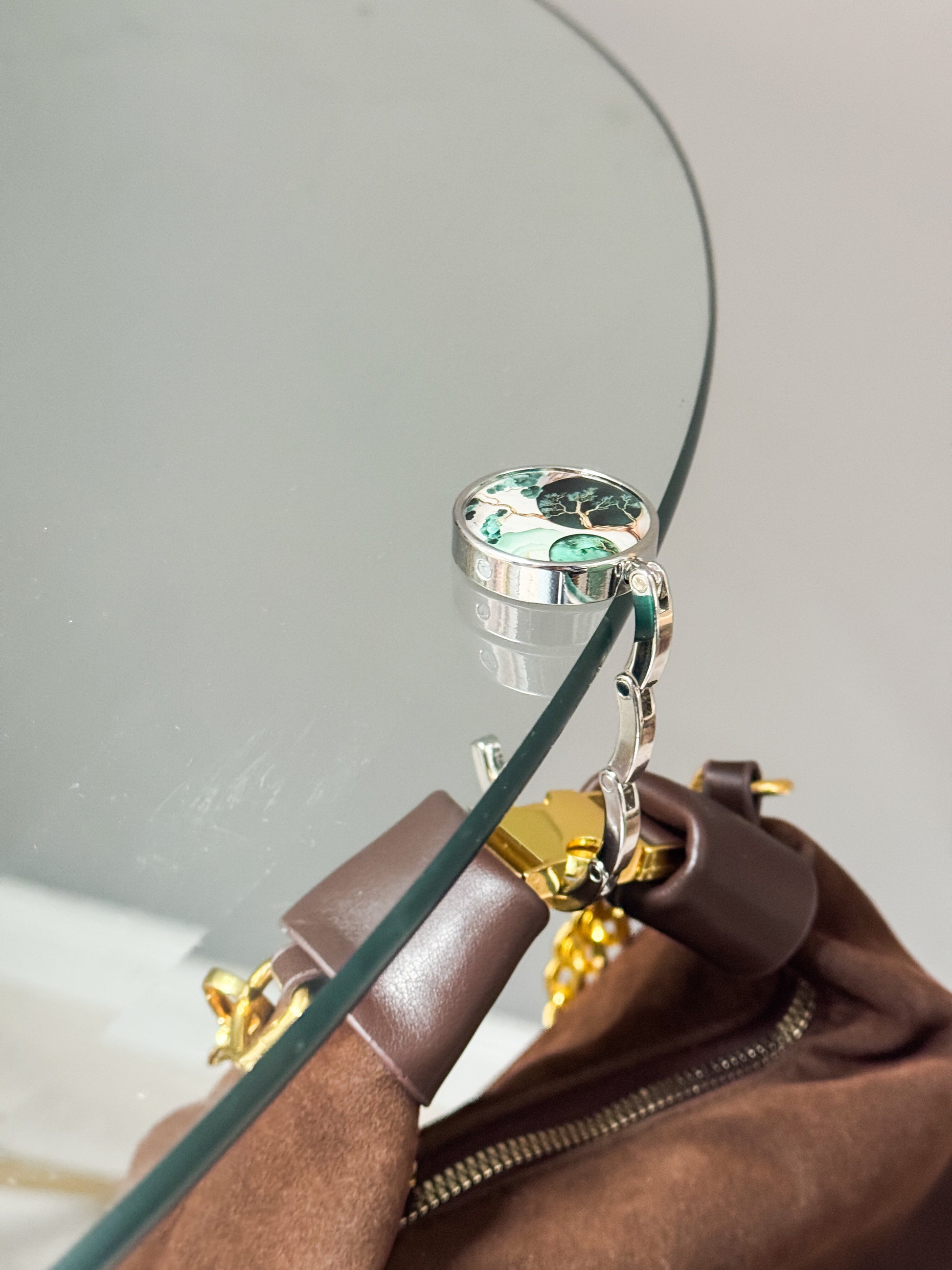 Katras dāmas somiņā jābūt šim "must-have" aksesuāram, jo katrai bijusi reize, kad aizej uz restorānu, bāru, skaistumkopšanas salonu, konsultāciju, BET nav kur nolikt somiņu! Tā parasti tiek iespiesta aiz muguras vai neērti turēta klēpī, tamdēļ palīgā nāk šis monētas izmēra turētājs, kuru ērti piestiprina pie galda virsmas. Tam apakšā ir silikona pretslīdes materiāls, kas nodrošina, ka somiņa turēsies, nenokritīs, savukārt, Tu varēsi nesatraukties par to!